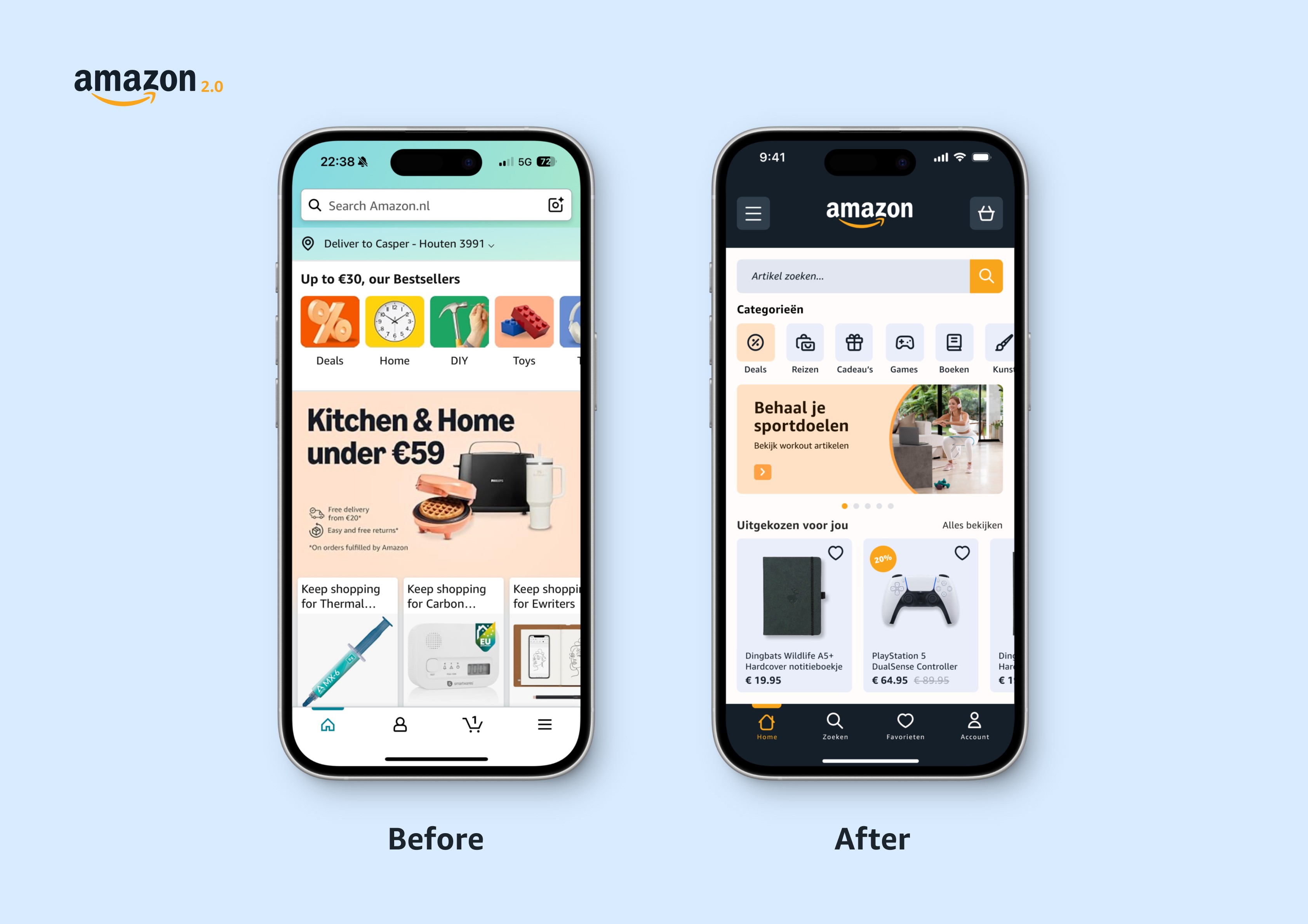 Om mezelf te verbeteren op het gebied van webshopdesign heb ik een redesign gemaakt van Amazon Nederland. Ik heb zowel de desktopversie als de app opnieuw ontworpen. Het doel was om binnen de stijl van Amazon te blijven, maar het geheel strakker en moderner te maken.